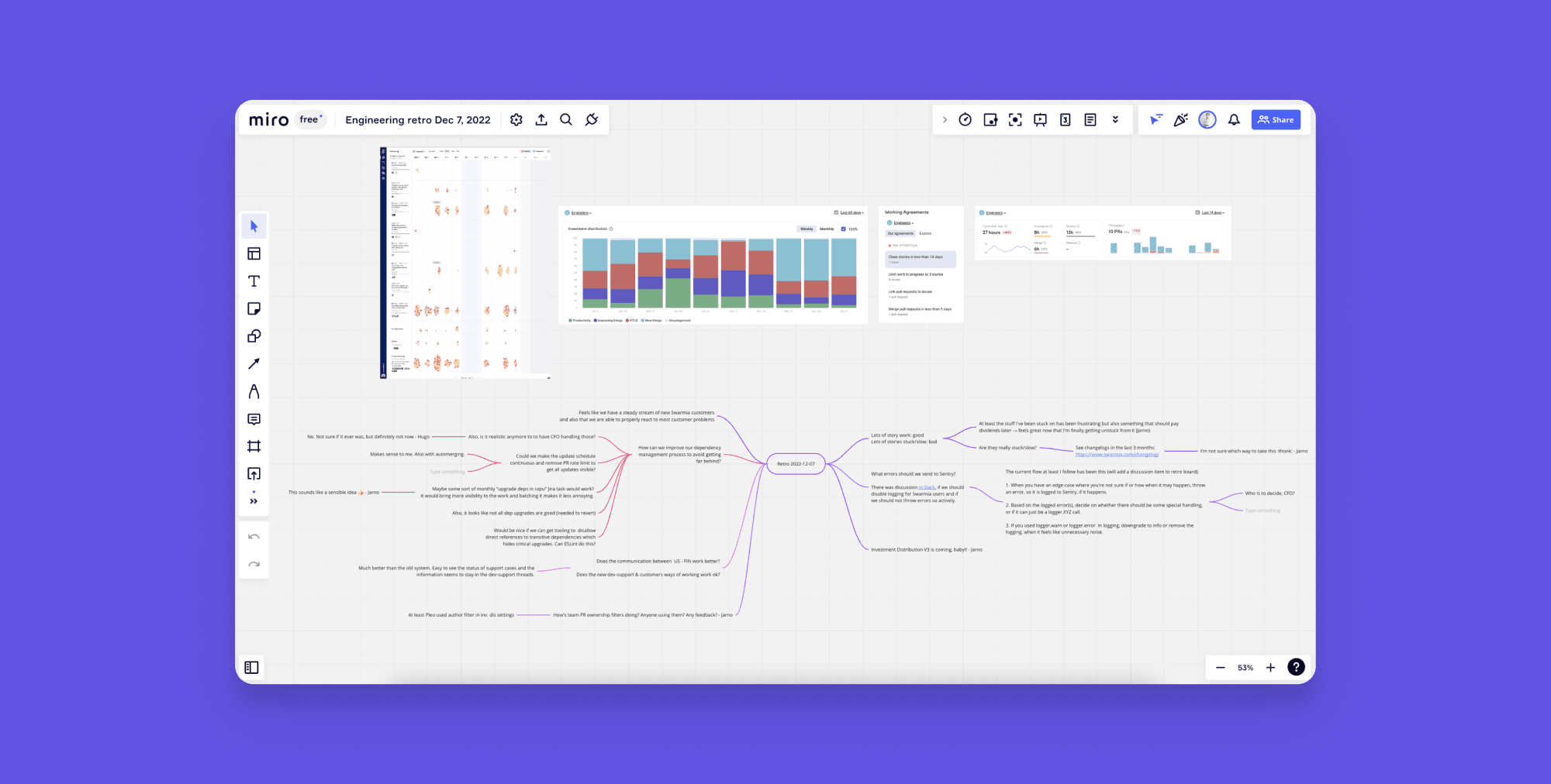 We use Miro for facilitation. Usually, we have a mind map where we write topics for 15 mins, and then discuss them, but sometimes we mix in different retrospective formats to keep it fresh.