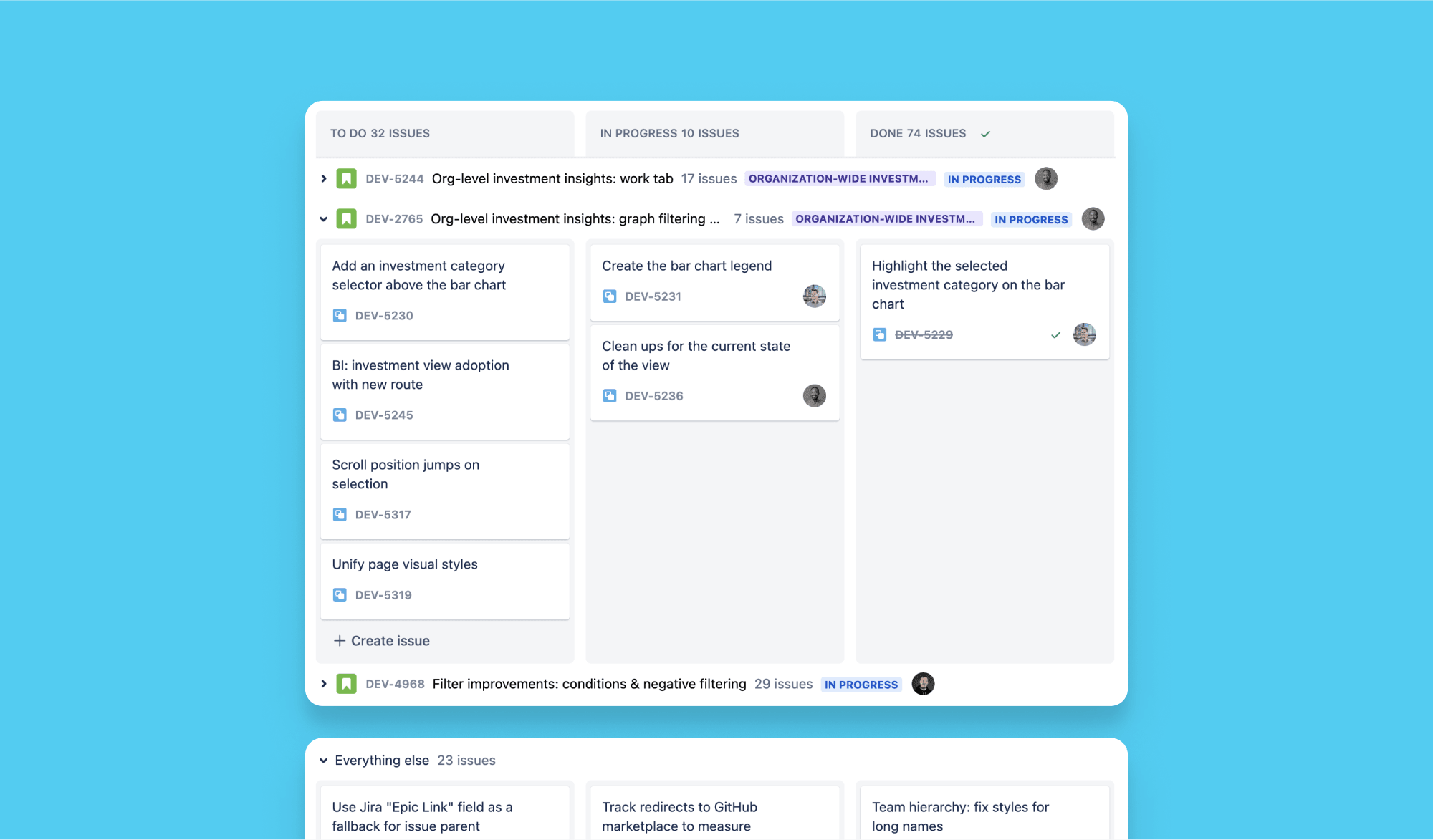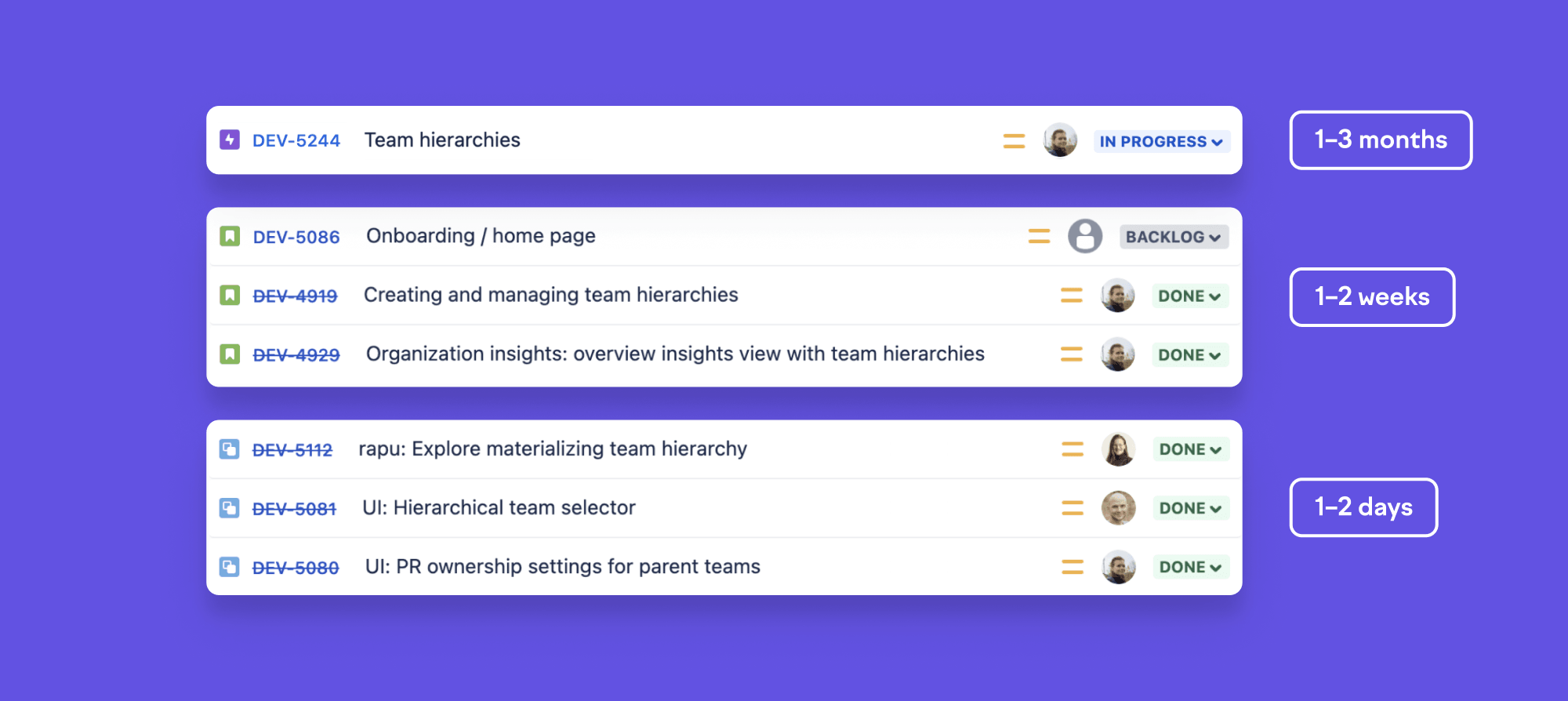 Epics are our bigger projects or features, and should take 1-3 months to complete. An example would be our recent project: introducing team hierarchies everywhere in the product.