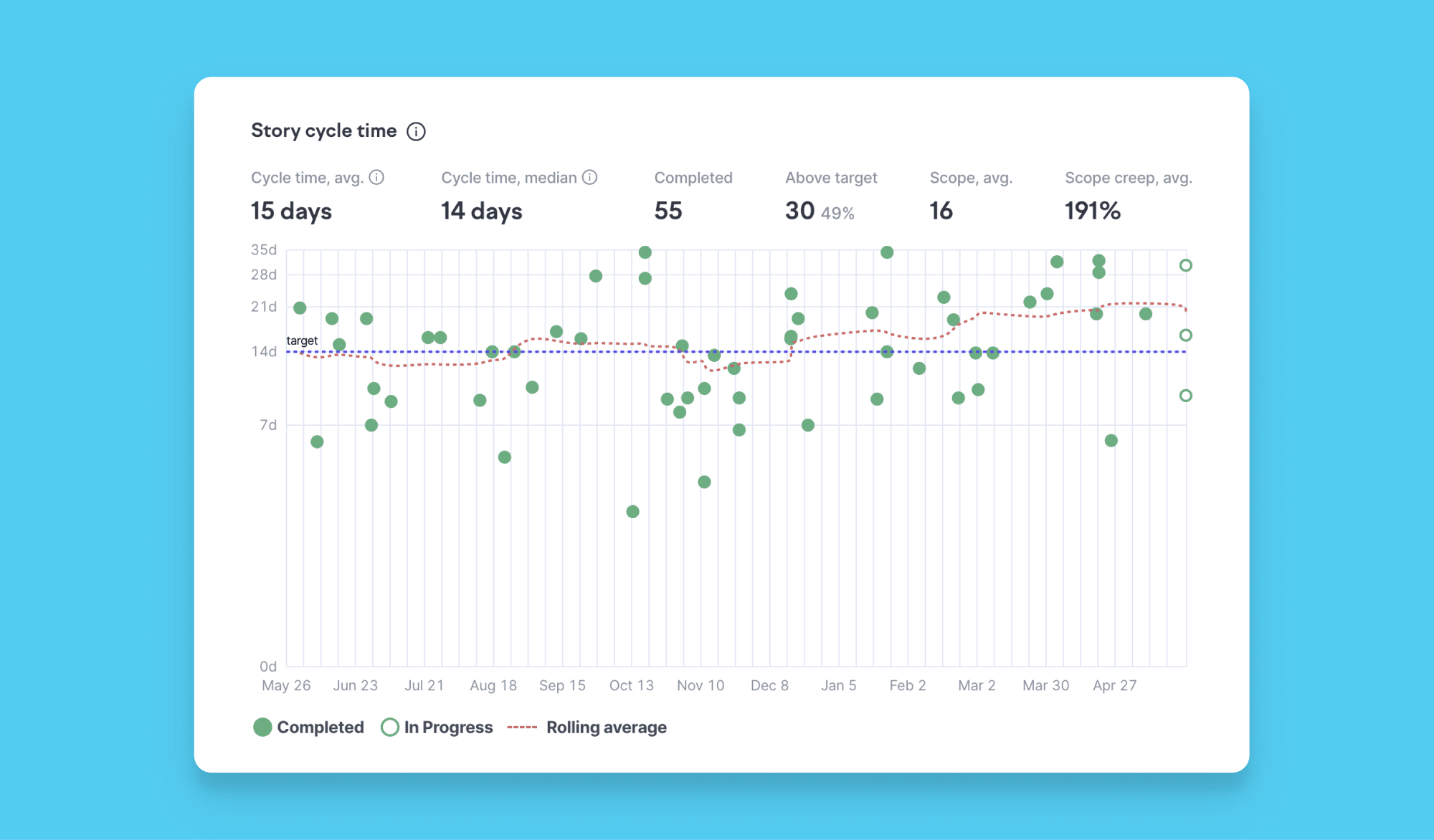 It takes quite a bit of practice to get good at consistently scoping the work to meet these time guidelines. In the beginning, you should try to make your stories complete in 1 week, which makes it more likely that you will hit the target of 2 weeks.