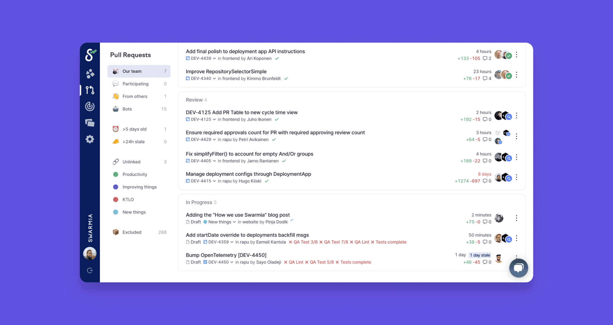 At Swarmia, we get to see hundreds of different development workflows from our customers, and have greatly enjoyed learning from them. We felt that it would be appropriate for us to return the favor and open up our own workflow.