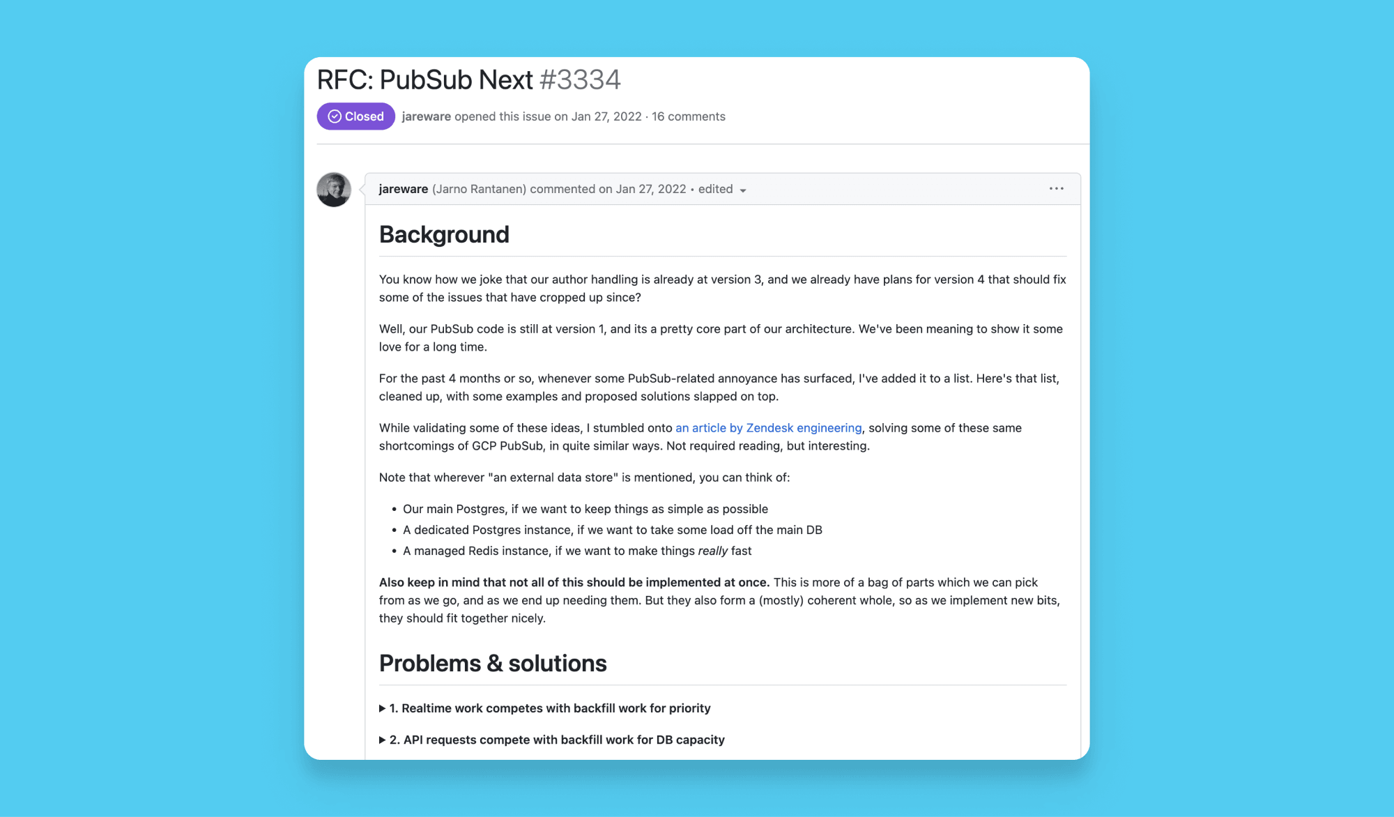When planning big technical projects like architectural changes, we like to use RFCs (request for comments) to facilitate the discussion. A developer writes up a technical proposal for a plan well in advance (we use GitHub Issues for this), and others then comment on it. This ensures that everyone gets to say their piece and is up to date with the plan. When all comments have been addressed, the work on the change can proceed.