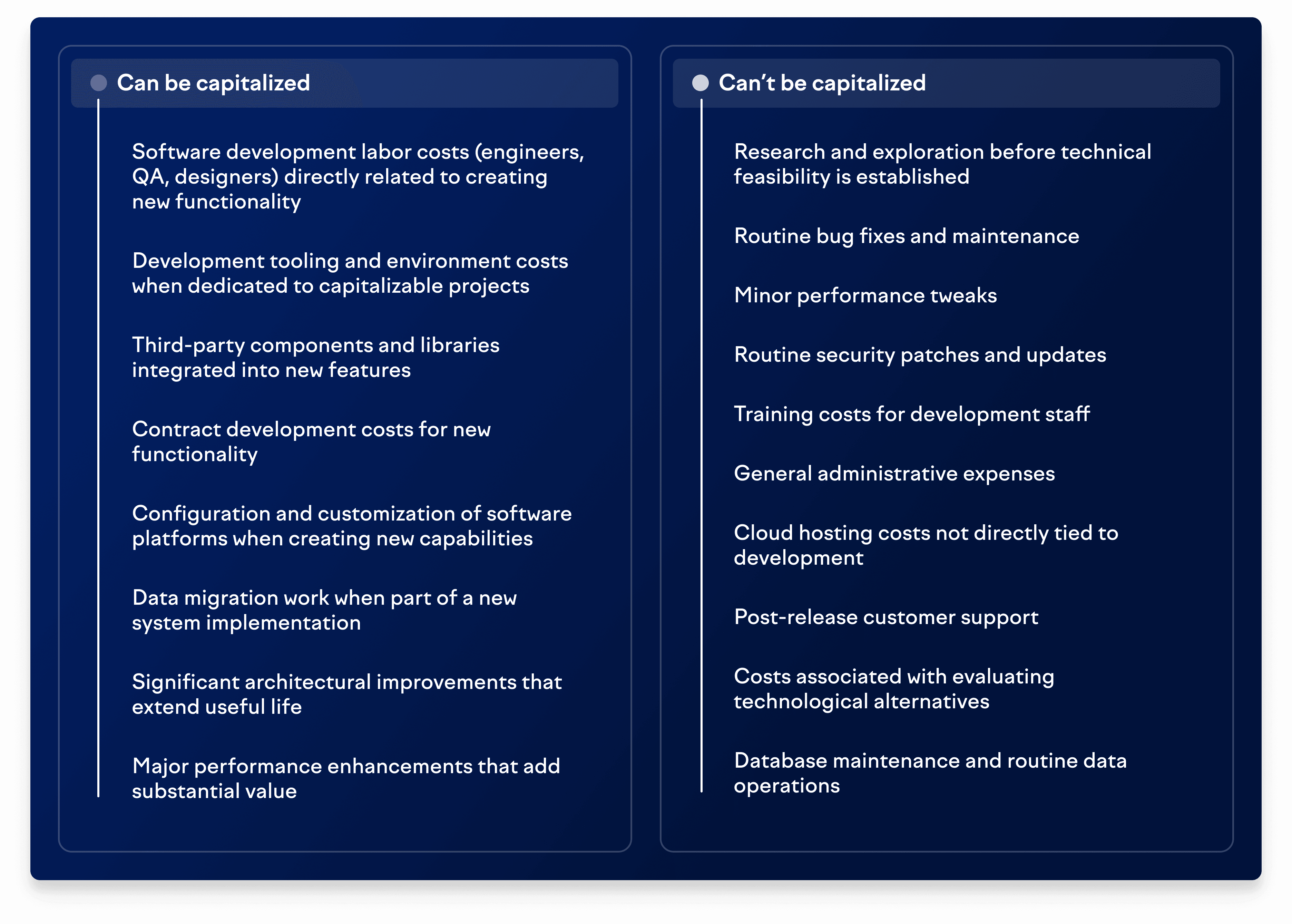 So now that we've covered the benefits of capitalizing software development costs and how the rules work in different parts of the globe, you might be wondering: Which of my engineering team's activities are actually worth capitalizing? Fear not — we’re about to get into the nitty gritty here.