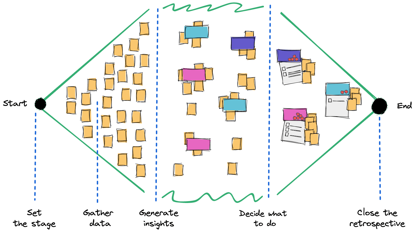 There is a multitude of ways you can run a retrospective. This blog post will use the 5-step retrospective structure from the book "Agile Retrospectives." It is one of the most well-known options and is a great, generally applicable approach to running a retrospective. Most retrospectives we've seen teams run use at least some parts of its structure.