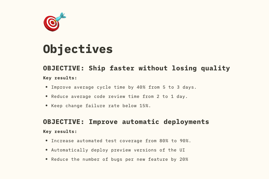 To get started with data-driven retrospectives, take inventory of the "hard data" sources you already have. Many organizations have KPIs, OKRs, or similar to make sure the teams in the organization are prioritizing the right things business-wise. You might also have insights from your version control system like GitHub and issue tracker like Jira. Sales and customer success data is also often valuable. If you're already running developer surveys, you can run retrospectives using survey response data too.