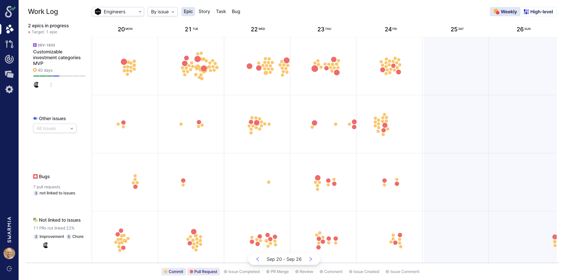 This is the part where I get to toot our own horn (toot, toot!) as we use our own product in our retrospectives. work log is Swarmia's unique feature that visualizes what has happened within a specific week. It allows us to see at a glance how much of our activities went into the roadmap (e.g., epics or stories) and how much attention we put into individual issues, bugs, and unplanned work. It includes most of the same information as the manually built "timeline" discussed above, except it automatically updates in real-time.