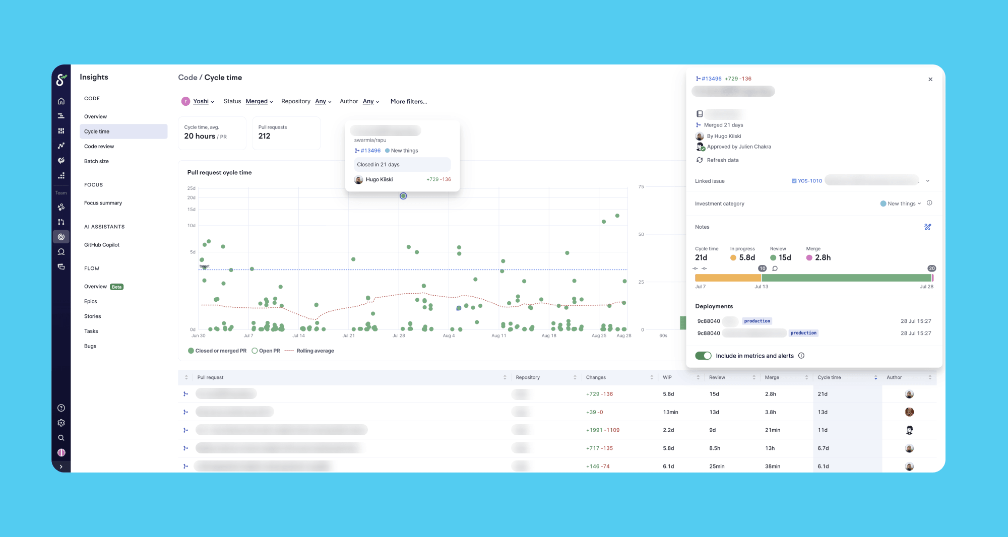 Cycle time — the time it takes to get code to production — is one of the most important metrics for understanding your development process. It reveals bottlenecks in code reviews, testing, and deployment. It’s a team metric.