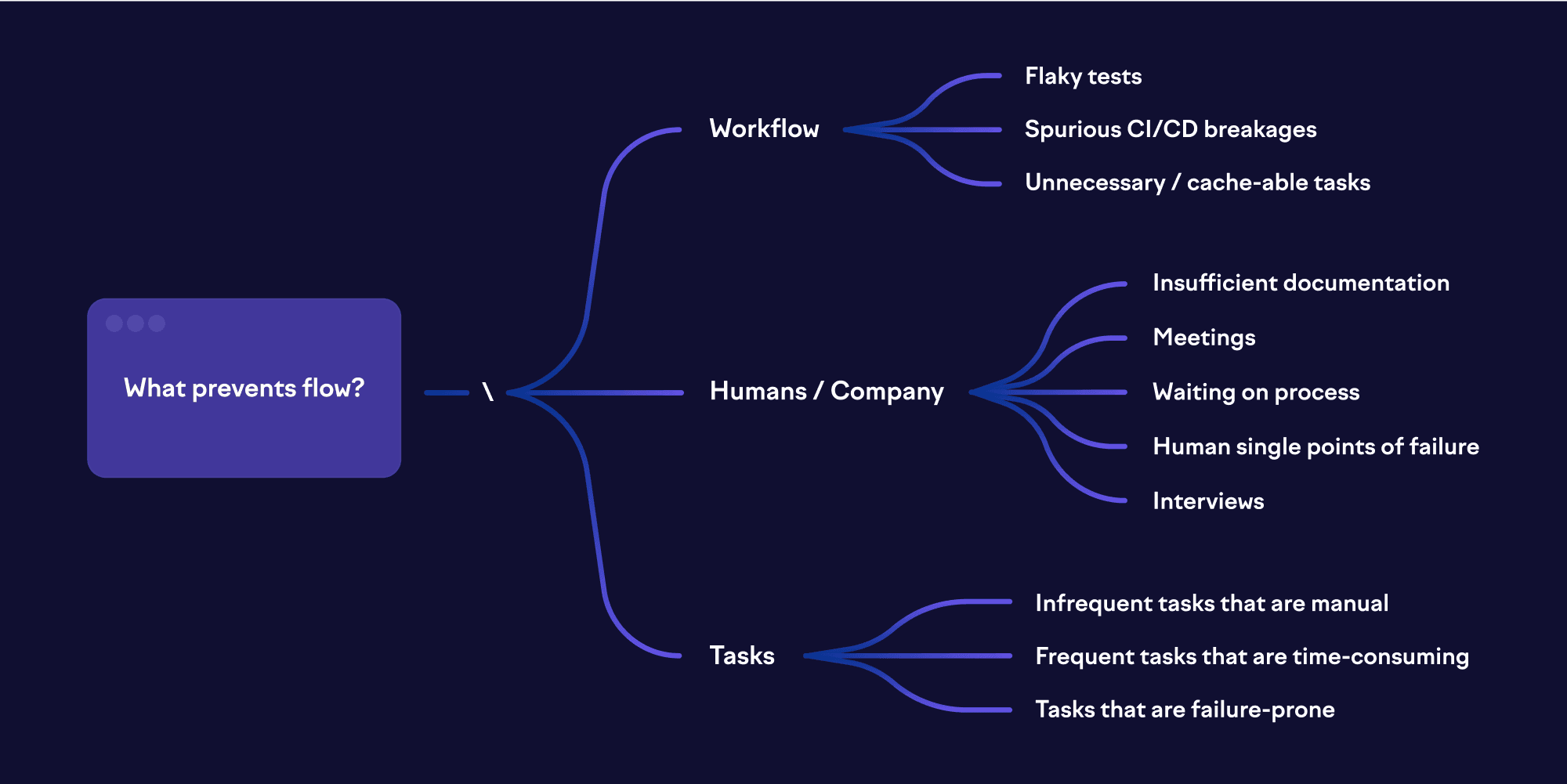 The productivity challenges facing a 10-person startup look nothing like those at a 500-engineer enterprise. As your org grows, bottlenecks are likely to migrate from human processes to technical systems, and from team coordination to organizational complexity. Understanding where you are on this spectrum helps you focus on the right problems.