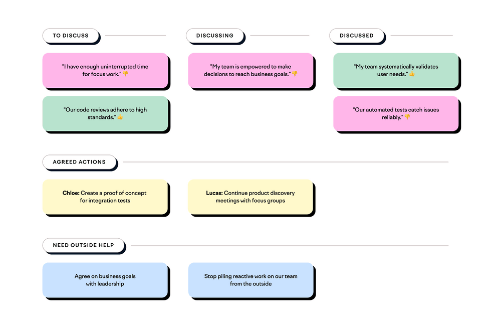 Survey retrospectives are one tool in your kit for facilitating those bottom-up insights. These sessions help teams gather the full story behind the responses, identify focus areas, and collaboratively create action plans.