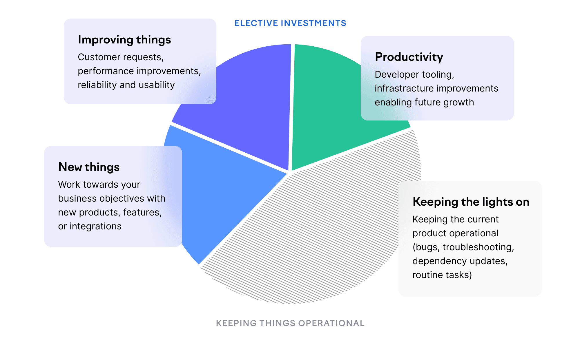 Investment balance is the percentage of time spent on new things, improvements, productivity, and keeping the lights on. Before having a reliable measurement of your org’s investment balance, the difference between where most leaders think engineering effort goes versus where it actually goes can be quite an eye-opener.