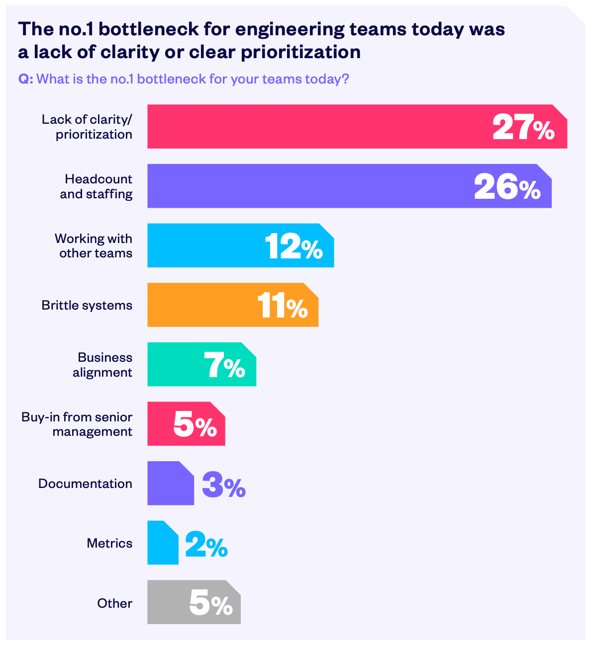 The post-ZIRP (zero-interest rate policy) upheaval is real and ongoing and has perhaps overshadowed more perennial concerns: working with other teams (12%) and documentation (3%) were cited much less frequently as bottlenecks.