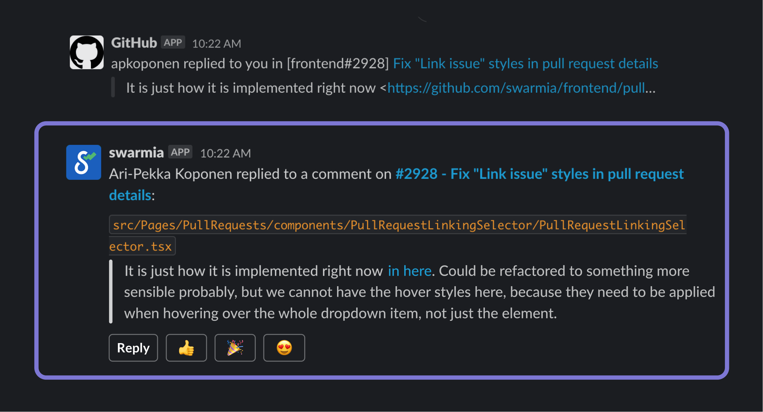 When we started building Swarmia, we found a surprising lack of Slack tooling for GitHub, the biggest developer platform out there. Why weren’t there good Slack notifications and interactions for GitHub? We saw an opportunity to improve the quality of developers’ life — and that’s exactly why we’ve put a lot of effort into our bi-directional integration between GitHub and Slack.