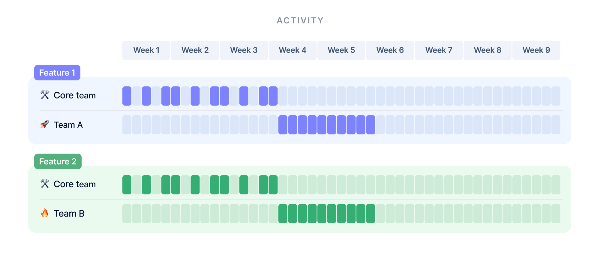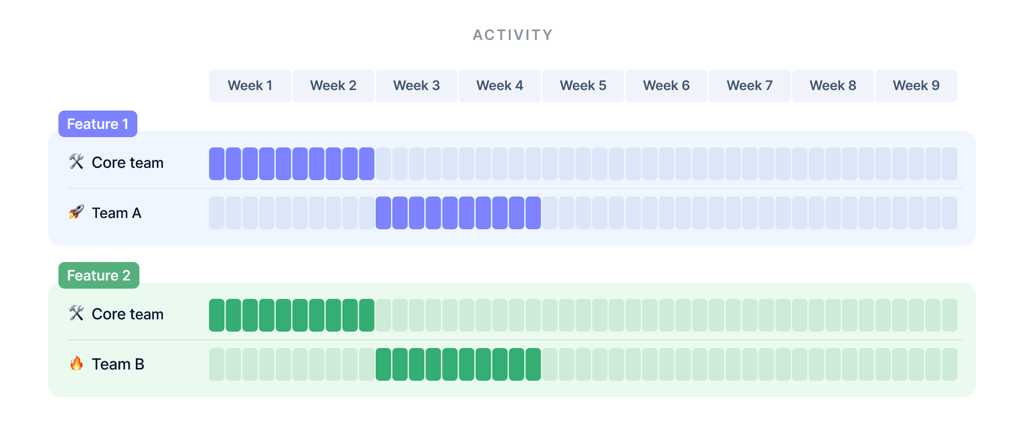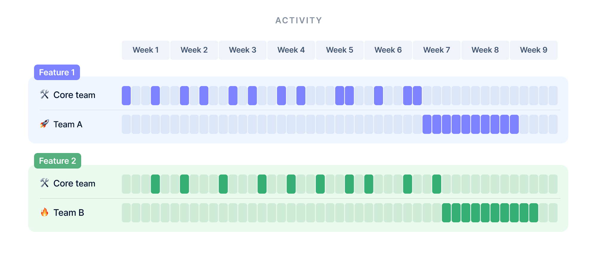 Let’s imagine three teams: the Core team and two feature teams, A and B. Both feature teams are building their own new feature that requires 10 days of work from the Core team. Only after the Core team has finished their contributions, the feature teams can start their own task that requires an additional 10 days of work.