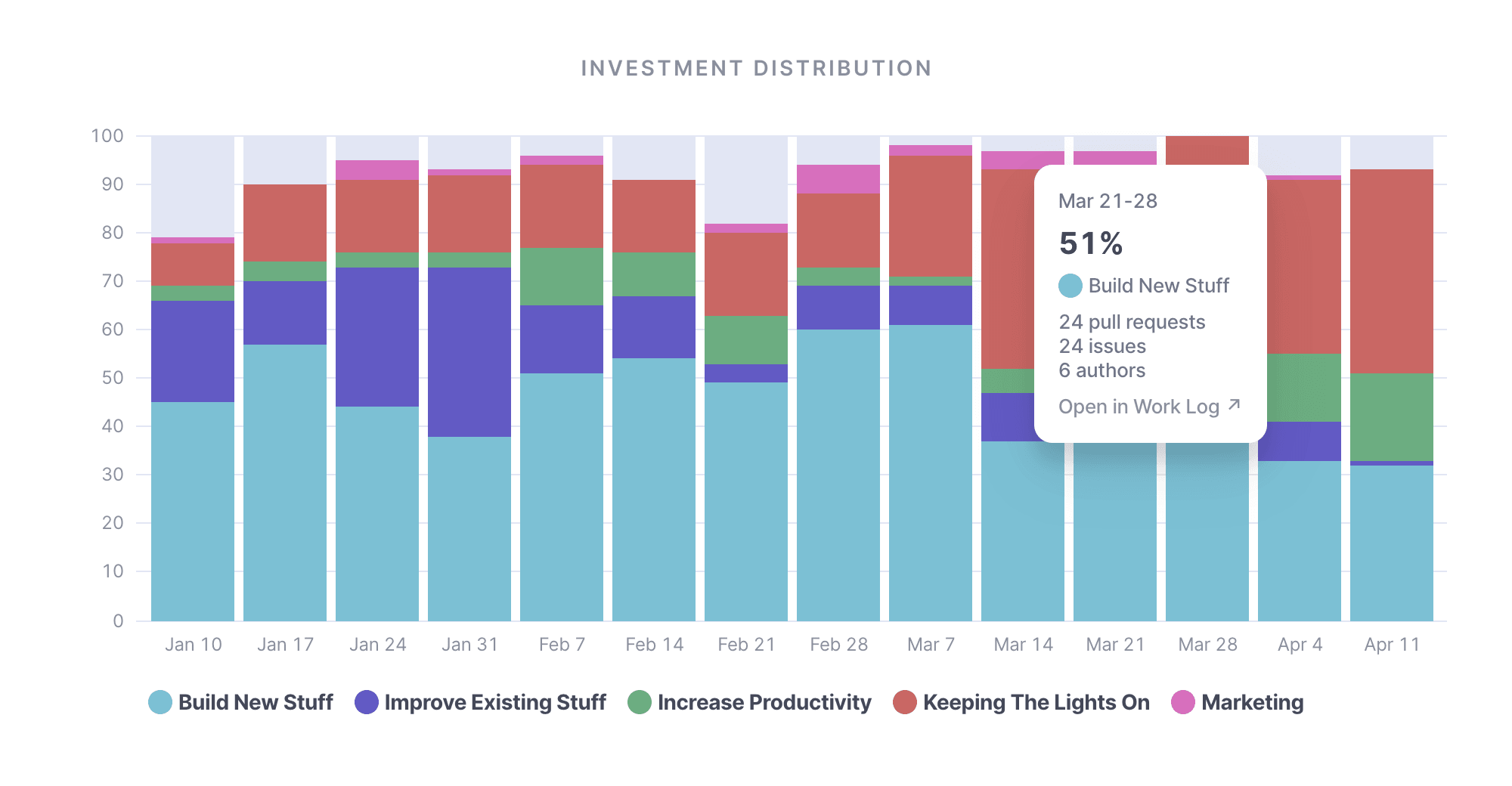 The investment distribution above has been configured to use the categories recommended by Dropbox’s VP of Engineering. We can see how much reactive work goes into “keeping the lights on.” We can also see how much effort goes to “building new stuff,” “improving existing stuff,” and “increasing productivity.”