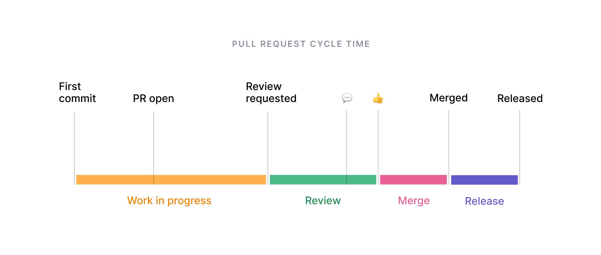 In Swarmia, we track lead time for changes through pull request cycle time. Our cycle time metric is broken down into four distinct parts: time in progress, time in review, time to merge, and time to release.