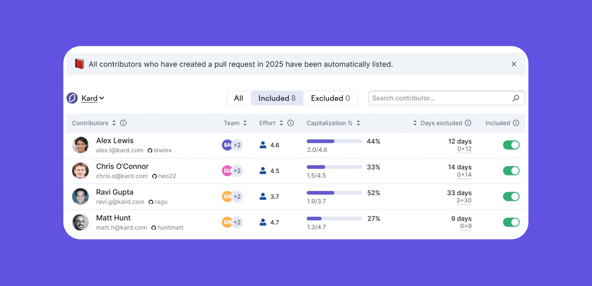 The model also accounts for periods of inactivity. If a developer is out of office or not actively contributing, their allocated effort is reduced accordingly. You can even sync time off data directly from your HR system to keep things accurate. This happens behind the scenes, with no manual tagging or time entry required.