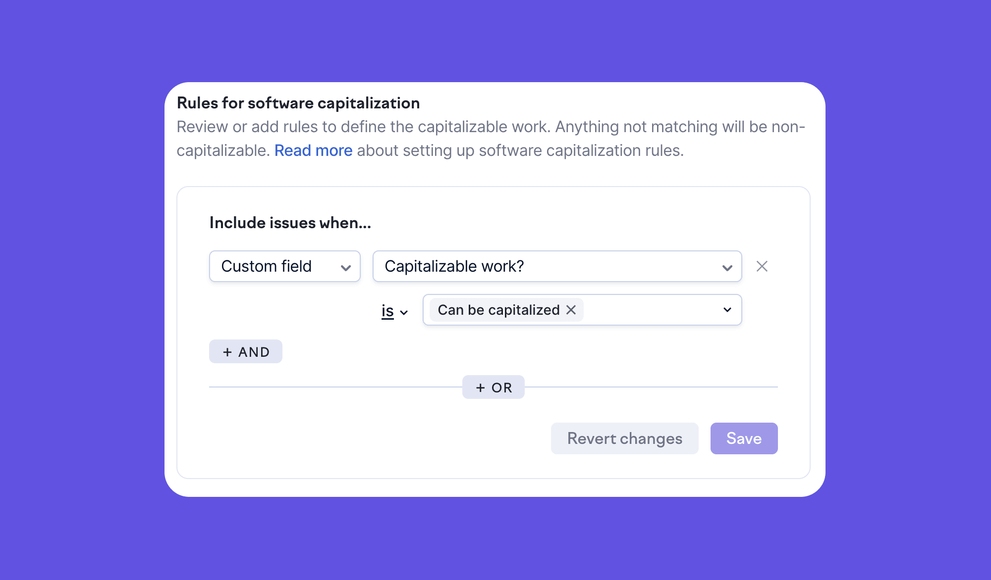To get started, you’ll define the rules determining what counts as capitalizable work. This typically involves setting up filters in Swarmia that align with your existing issue tracker setup, such as labeling capitalizable epics or categorizing work under specific initiatives.