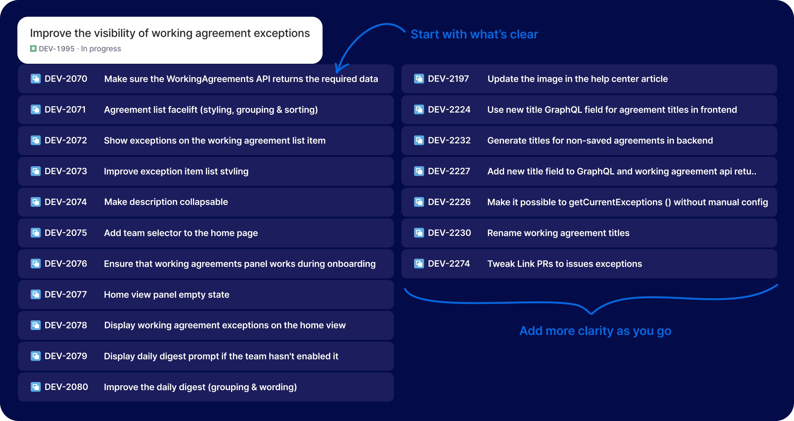 We don't use user stories when we break down the story into tasks. Our friends at Linear have written an excellent critique on user stories and it happens to align well with our thinking. Simply put, because we already understand the context, we prefer to maximize the clarity of what actually needs to be done. We've paid attention to formulating the why in the story as a simple goal, but we leave it there.