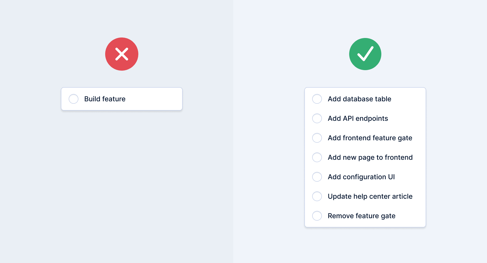 To work in small pull requests, you need to learn how to split your work into smaller parts. For example, instead of working on a single huge “build feature” task, you should have a list of small, incremental tasks like “add database table”, “add feature gate”, etc.