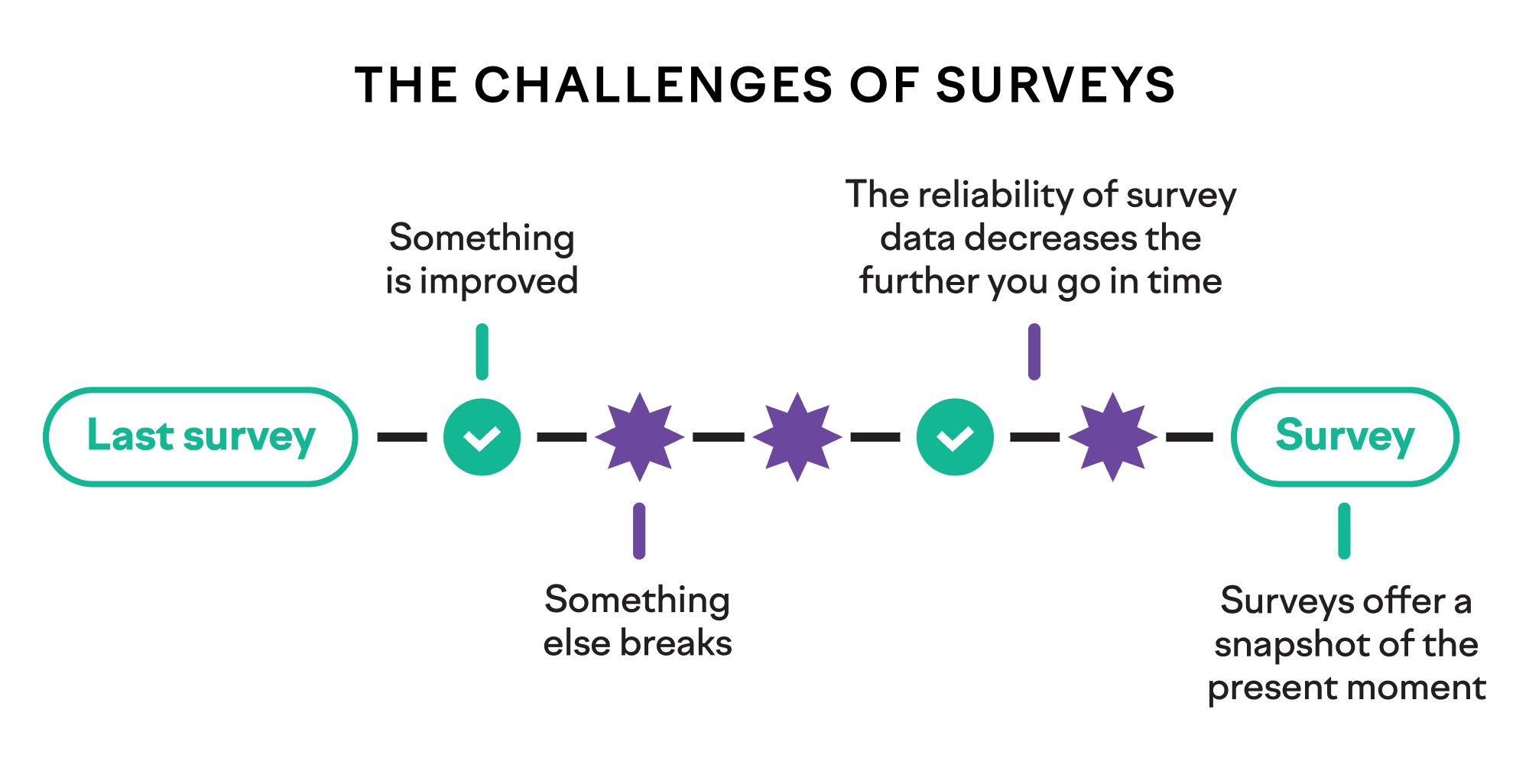 Then there’s the challenge of striking the right frequency. If you deploy surveys too often, you may run into survey fatigue, diminishing the quality and quantity of feedback. However, sparse surveys can fail to capture rapidly evolving sentiments.