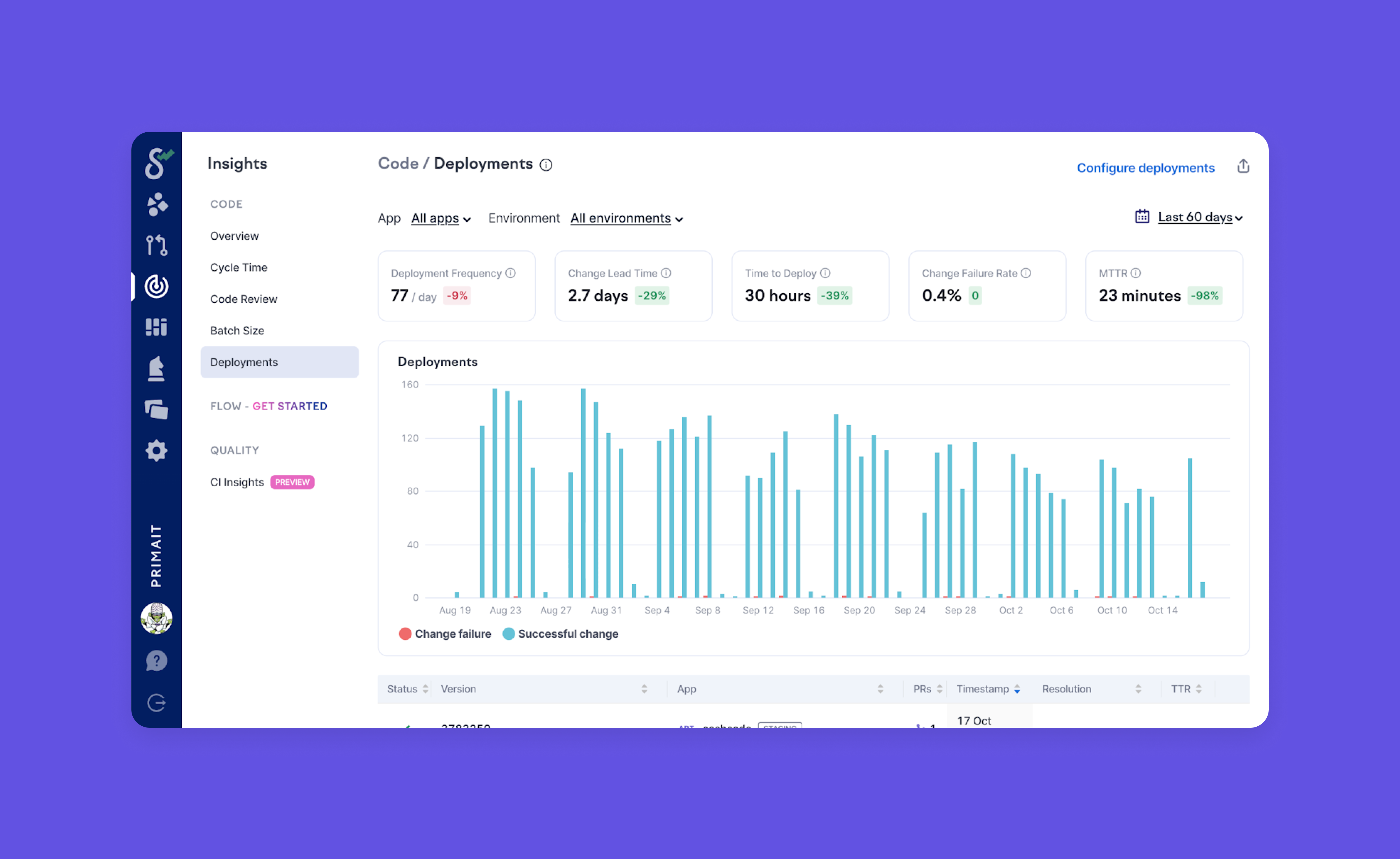 Choosing a tool for tracking DORA and other engineering metrics quickly became a critical project at Prima, as the company is known for its focus on technology and data. In addition to finding a partner that was aligned with Prima’s values, the goal was to arrive at a consistent measurement framework across teams and domains.