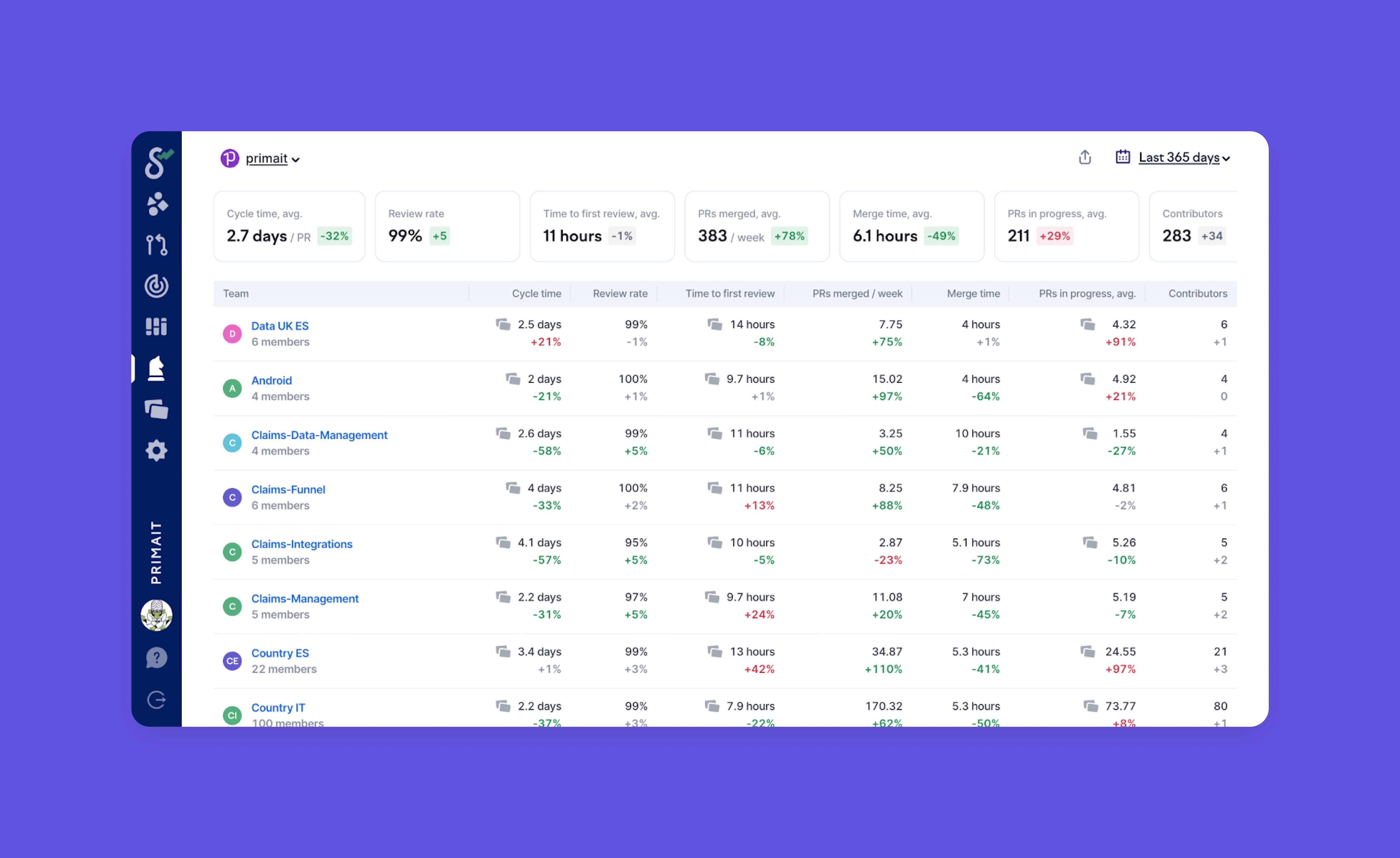 After using Swarmia for over a year, the Prima engineering organization has experienced massive productivity improvements across all engineering teams and domains.