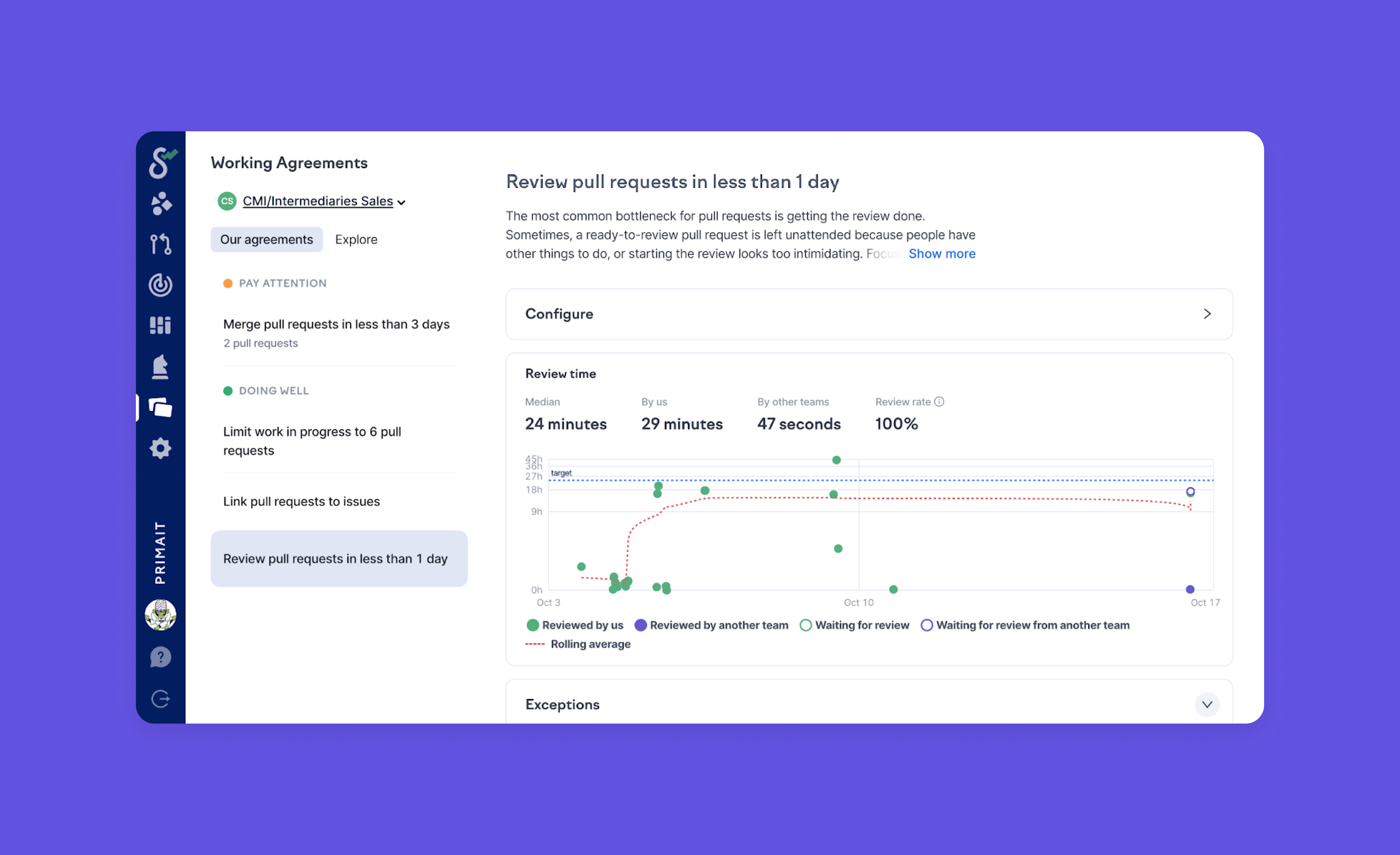 The engineering managers at Prima have found Swarmia’s working agreements and Slack notifications to be extremely valuable. The working agreements are particularly useful every time new teams are established in the growing engineering organization.