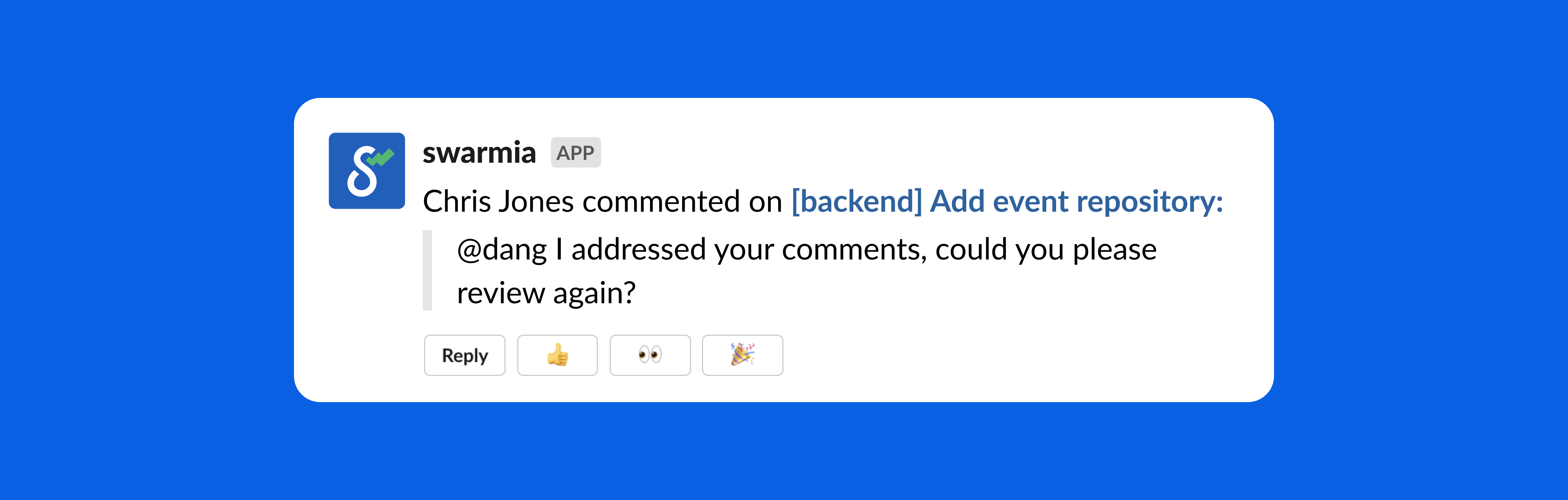 We can have full conversations with replies directly with the Swarmia Slack bot rather than logging into GitHub. We get a notification if anything in our commit fails a check or if anything wonky happens in a pipeline during deploy. The days of babysitting a merge are gone.