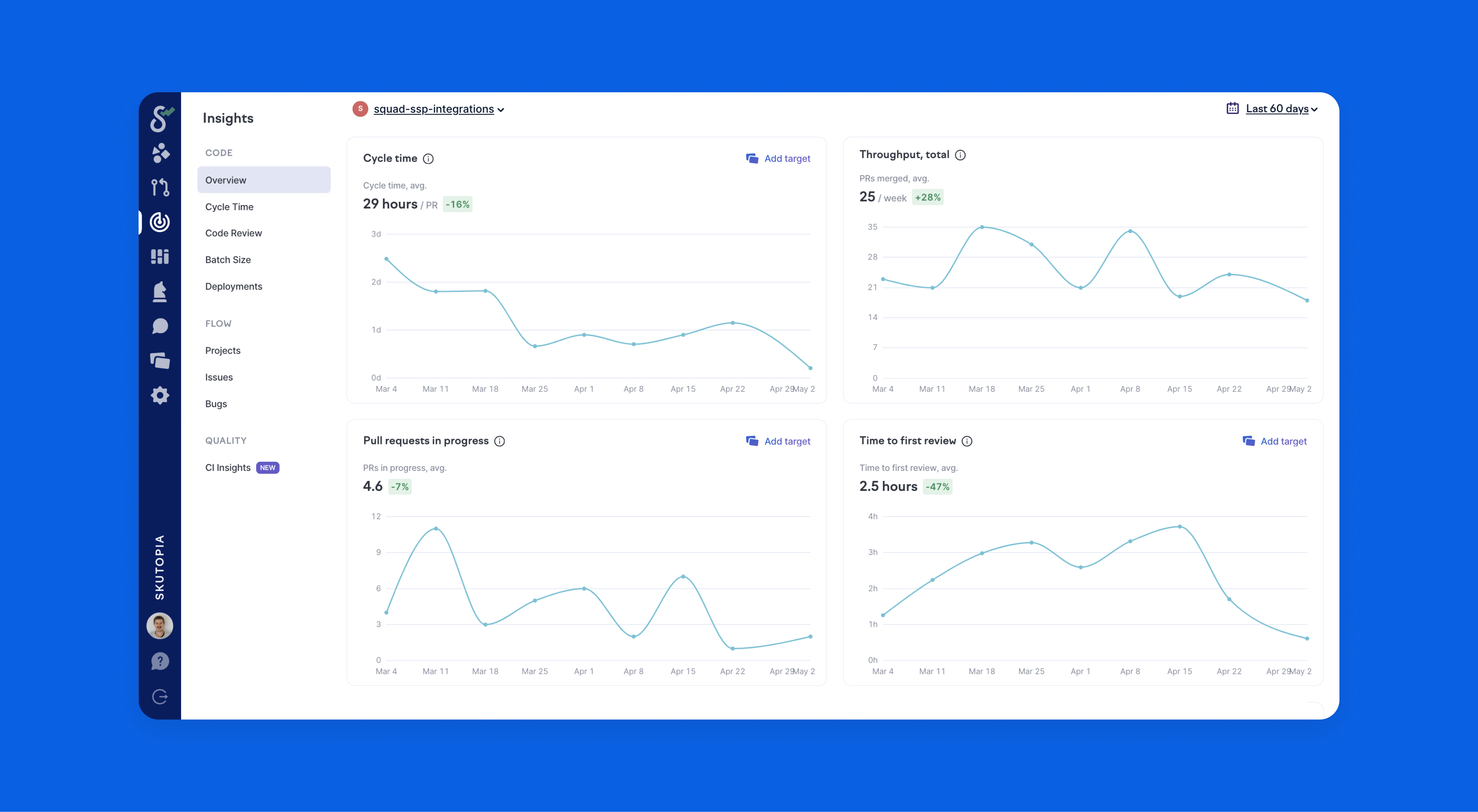 Dan and the whole SKUTOPIA engineering organization have been happy with the end-to-end visibility Swarmia provides. In a short time, they’ve noticed a positive impact on their code review times, which has allowed them to dramatically reduce their cycle times.