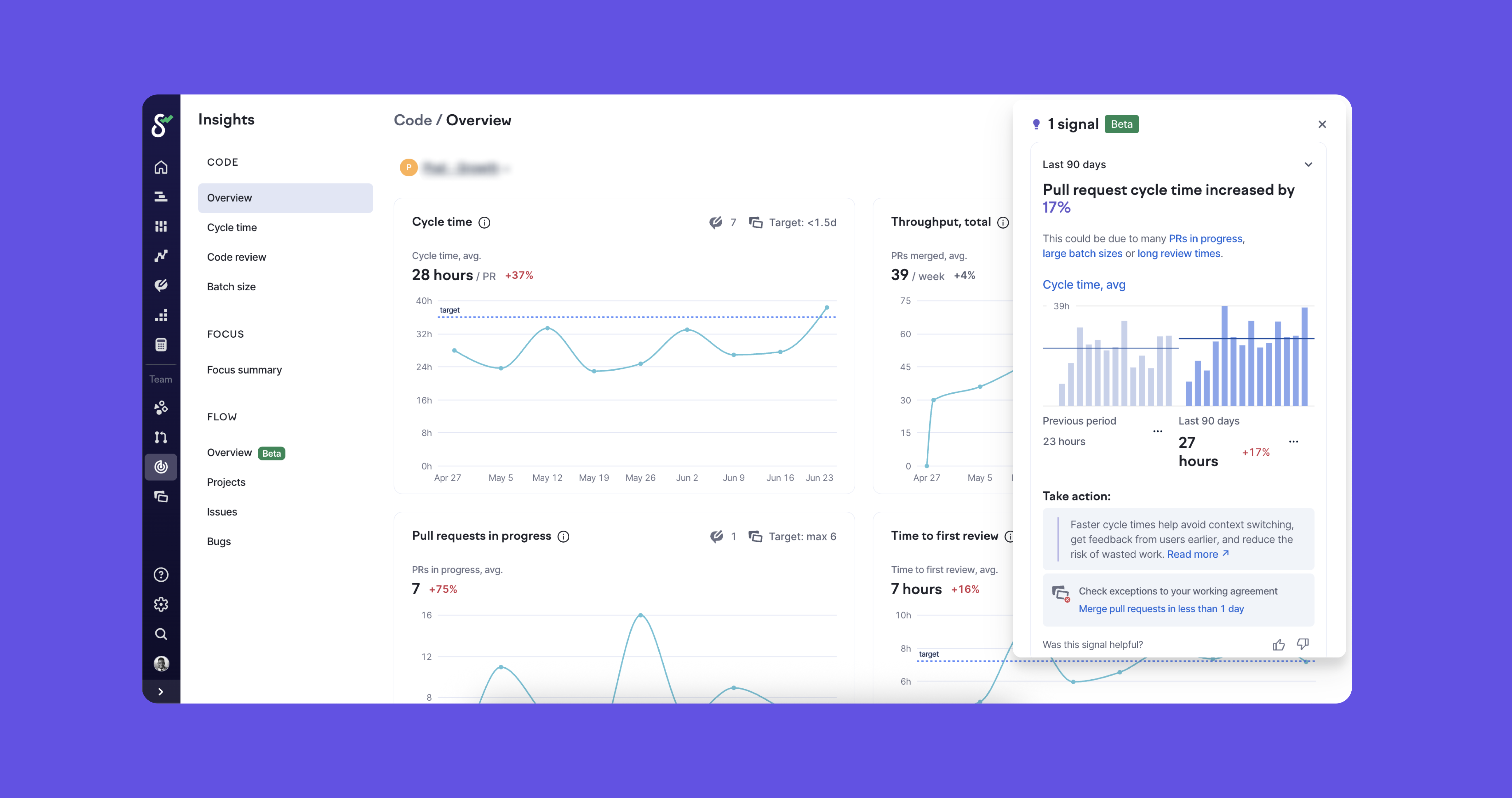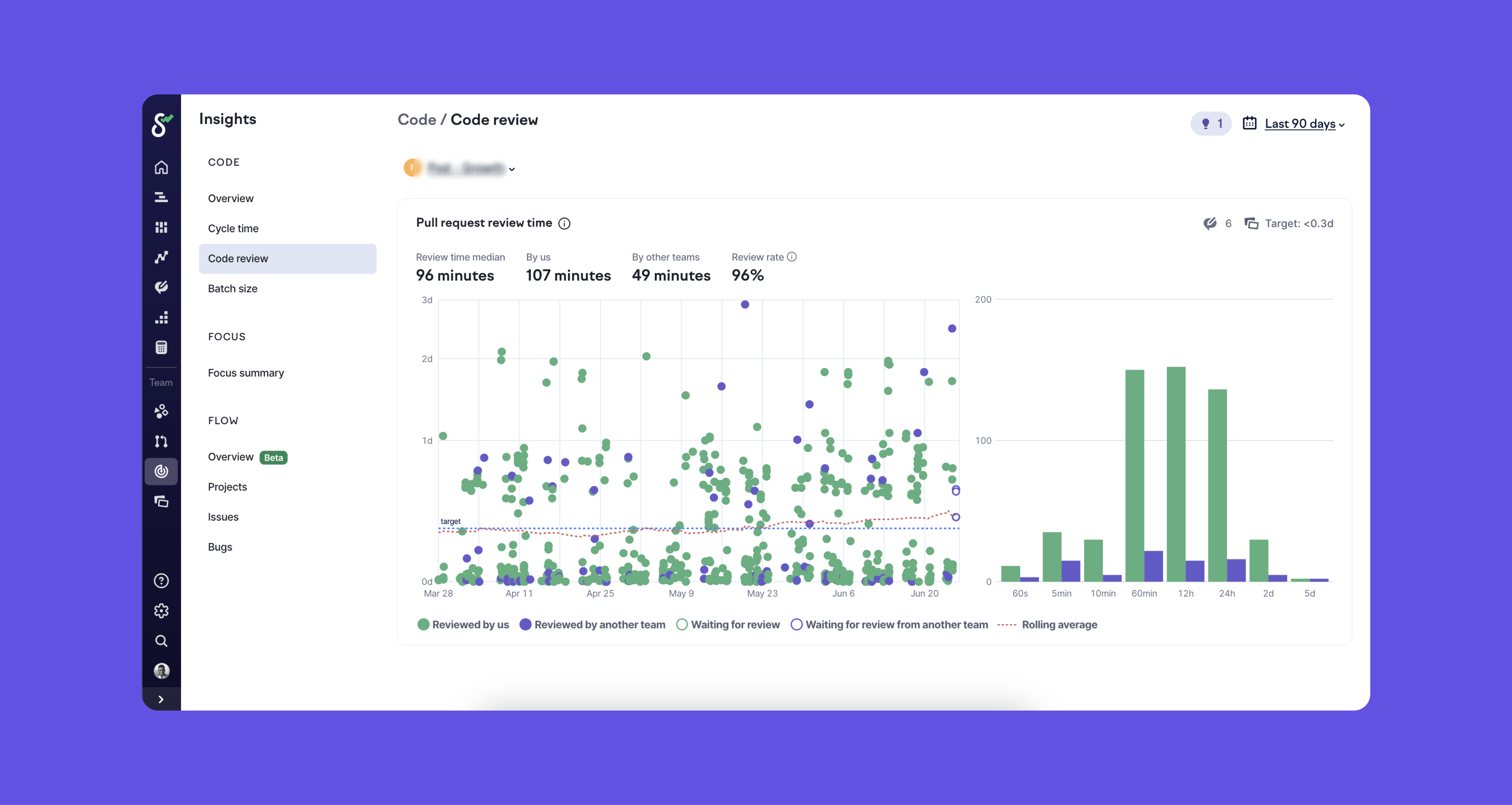Today, that same team gets pull requests reviewed in 2-6 hours (down from 8-12 hours), with cycle time down from 2.5 days to just 26 hours. This has had positive flow-on effects on the team culture, with engineers proactively helping teammates who need reviews.